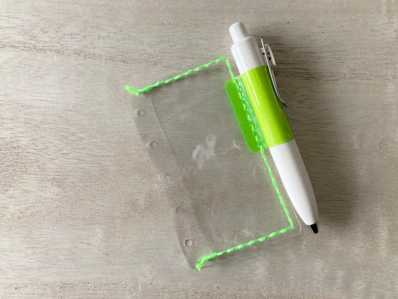ピンクとグリーンのビニル生地は、目打ちをせずに針を入れると、びよ~んと生地が伸びるほど、薄いけど丈夫です。なので心配はないかと思いますが、念の為お伝えしています。